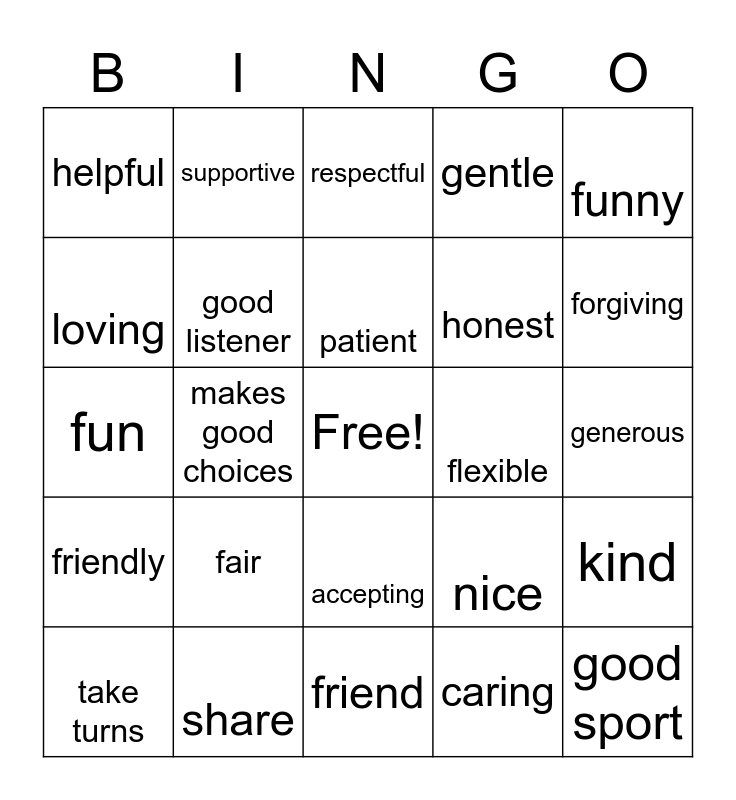This bingo card has a free space and 24 words: fair, share, patient, take turns, funny, helpful, loving, supportive, flexible, accepting, honest, fun, nice, kind, good listener, caring, generous, respectful, forgiving, makes good choices, good sport, friendly, gentle and friend.