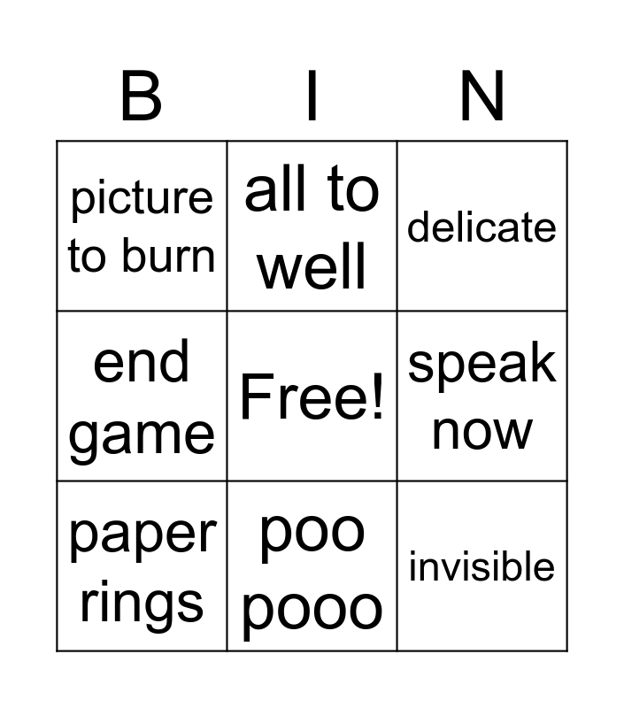 This bingo card has a free space and 8 words: speak now, delicate, all to well, paper rings, picture to burn, invisible, end game and poo pooo.