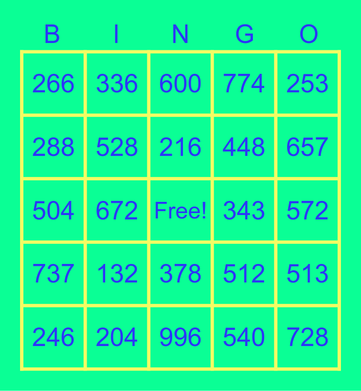 This bingo card has a free space and 24 words: 132, 204, 216, 246, 253, 266, 288, 336, 343, 378, 448, 504, 512, 513, 528, 540, 572, 600, 657, 672, 728, 737, 774 and 996.