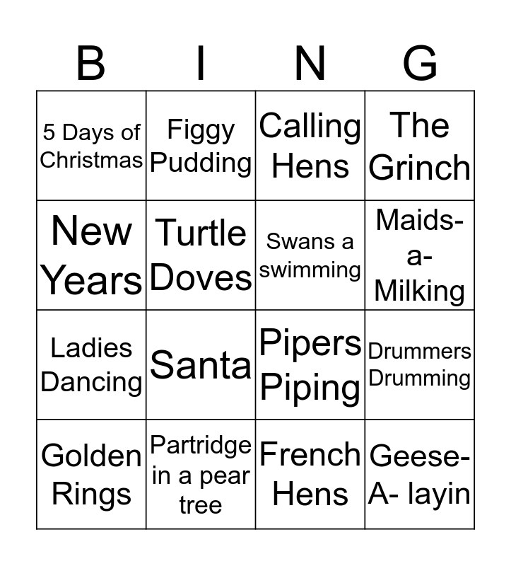 This bingo card has 16 words: Partridge in a pear tree, Drummers Drumming, Calling Hens, 5 Days of Christmas, Ladies Dancing, Figgy Pudding, Pipers Piping, French Hens, New Years, Turtle Doves, Golden Rings, The Grinch, Santa, Maids- a- Milking, Swans a swimming and Geese- A- layin.