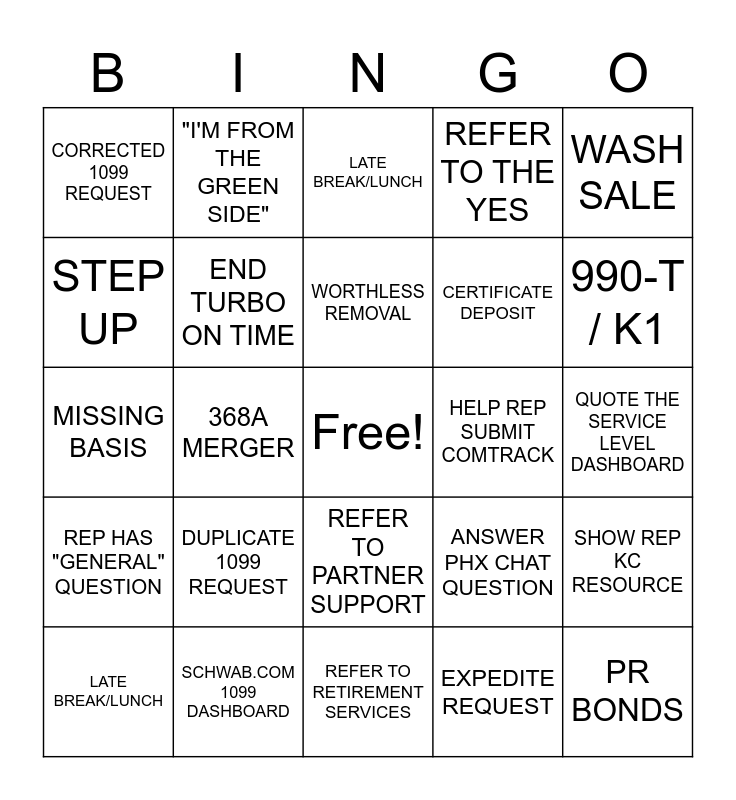 This bingo card has a free space and 24 words: DUPLICATE 1099 REQUEST, SCHWAB.COM 1099 DASHBOARD, WORTHLESS REMOVAL, LATE BREAK/LUNCH, WASH SALE, CORRECTED 1099 REQUEST, STEP UP, "I'M FROM THE GREEN SIDE", HELP REP SUBMIT COMTRACK, REFER TO PARTNER SUPPORT, CERTIFICATE DEPOSIT, MISSING BASIS, ANSWER PHX CHAT QUESTION, SHOW REP KC RESOURCE, END TURBO ON TIME, EXPEDITE REQUEST, QUOTE THE SERVICE LEVEL DASHBOARD, LATE BREAK/LUNCH, 990-T / K1, 368A MERGER, PR BONDS, REP HAS "GENERAL" QUESTION, REFER TO THE YES and REFER TO RETIREMENT SERVICES.
