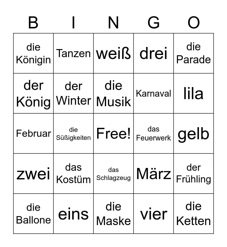 This bingo card has a free space and 25 words: das Kostüm, die Maske, die Musik, die Ballone, die Parade, die Königin, der König, Tanzen, das Feuerwerk, das Schlagzeug, Karnaval, Februar, März, der Frühling, der Winter, grün, gelb, weiß, lila, die Süßigkeiten, die Ketten, eins, zwei, drei and vier.