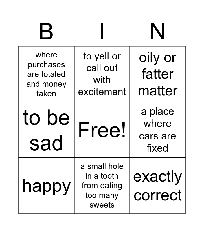 This bingo card has a free space and 8 words: a place where cars are fixed, oily or fatter matter, to yell or call out with excitement, happy, where purchases are totaled and money taken, exactly correct, to be sad and a small hole in a tooth from eating too many sweets.