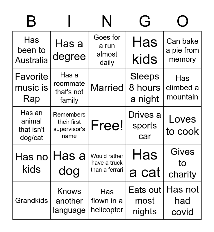 This bingo card has a free space and 24 words: Has a dog, Knows another language, Married, Grandkids, Can bake a pie from memory, Has been to Australia, Favorite music is Rap, Has a degree, Drives a sports car, Would rather have a truck than a ferrari, Sleeps 8 hours a night, Has an animal that isn't dog/cat, Has a cat, Gives to charity, Has a roommate that's not family, Eats out most nights, Loves to cook, Goes for a run almost daily, Has climbed a mountain, Remembers their first supervisor's name, Has not had covid, Has no kids, Has kids and Has flown in a helicopter.