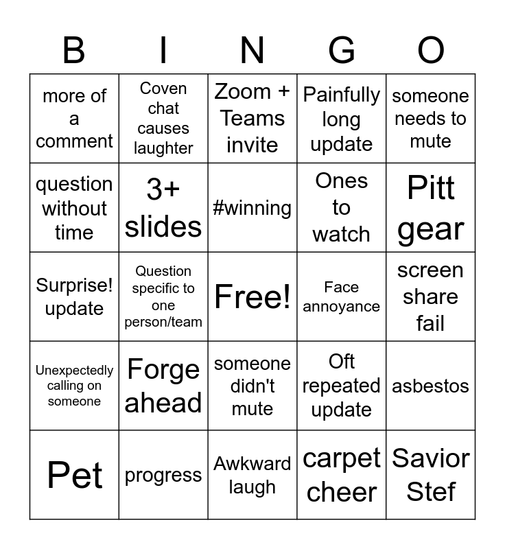 This bingo card has a free space and 24 words: Forge ahead, progress, #winning, Pet, someone needs to mute, more of a comment, question without time, Coven chat causes laughter, Face annoyance, someone didn't mute, Ones to watch, Surprise! update, Oft repeated update, asbestos, 3+ slides, carpet cheer, screen share fail, Zoom + Teams invite, Pitt gear, Question specific to one person/team, Savior Stef, Unexpectedly calling on someone, Painfully long update and Awkward laugh.