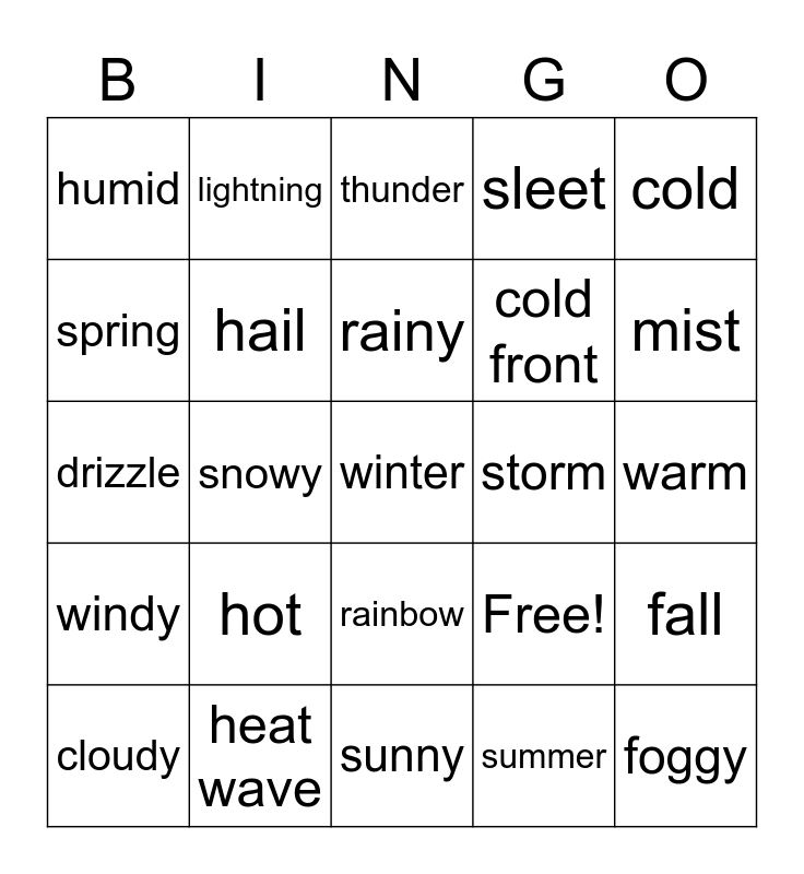 This bingo card has 25 words: hot, sunny, rainy, cloudy, cold, humid, spring, lightning, storm, rainbow, cold front, drizzle, Free!, fall, hail, foggy, warm, thunder, mist, snowy, winter, heat wave, windy, sleet and summer.