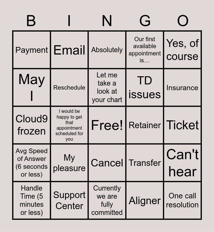 This bingo card has a free space and 24 words: My pleasure, Support Center, Let me take a look at your chart, Handle Time (5 minutes or less), Yes, of course, Payment, May I, Email, Retainer, Cancel, TD issues, Cloud9 frozen, Transfer, Can't hear, Reschedule, Aligner, Ticket, Absolutely, Insurance, I would be happy to get that appointment scheduled for you, One call resolution, Avg Speed of Answer (6 seconds or less), Our first available appointment is… and Currently we are fully committed.