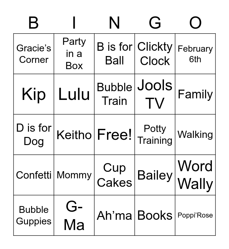 This bingo card has a free space and 46 words: Eryss, Poppi’Rose, Grandpa, Ah’ma, Mommy, One, Party in a Box, Word Party, Kip, Franny, Lulu, Clickty Clock, Word Wally, Bailey, Happy Birthday, Cake, Bubble Train, Potty Training, Dance, February 6th, Keitho, Books, Gracie’s Corner, Jools TV, Ma’Pa, Family, Bubble Guppies, Noodles, Cup Cakes, Confetti, Balloons, Candy, Pinata, Tilly, Pop Pop, G-Ma, Walking, Build a Bear, Princess, Bye Bye, A is for Apple, B is for Ball, D is for Dog, Love, Kisses and Toe toes.