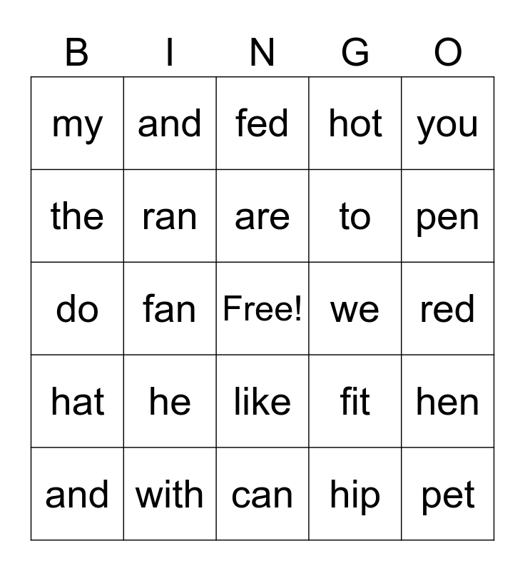 This bingo card has a free space and 24 words: he, with, are, and, you, my, the, and, we, like, to, do, fit, hen, ran, hip, red, fed, pen, fan, pet, hat, hot and can.