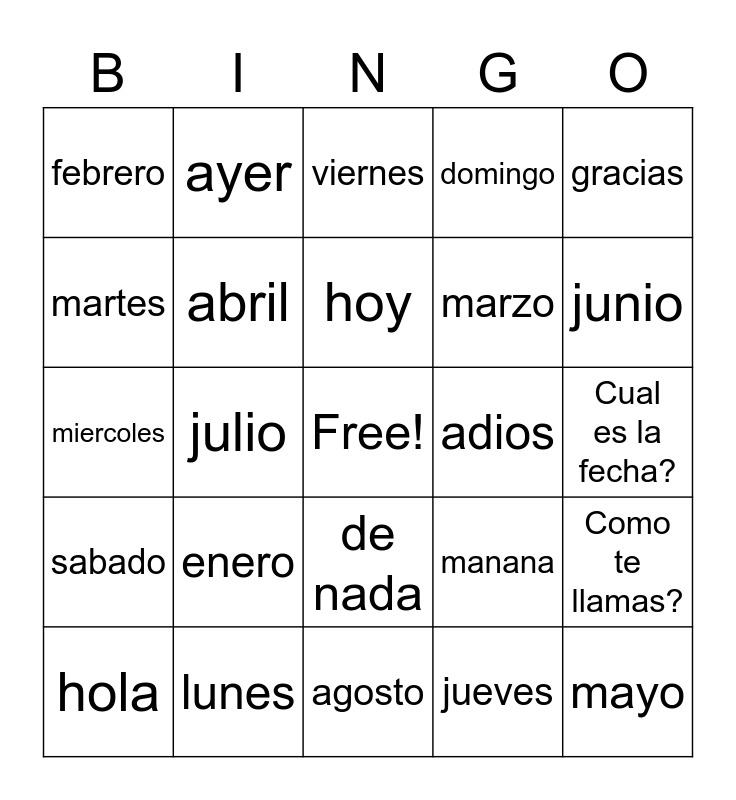 This bingo card has a free space and 24 words: enero, lunes, hoy, hola, gracias, febrero, martes, ayer, adios, de nada, marzo, miercoles, manana, Como te llamas?, abril, jueves, Cual es la fecha?, viernes, junio, julio, mayo, sabado, domingo and agosto.