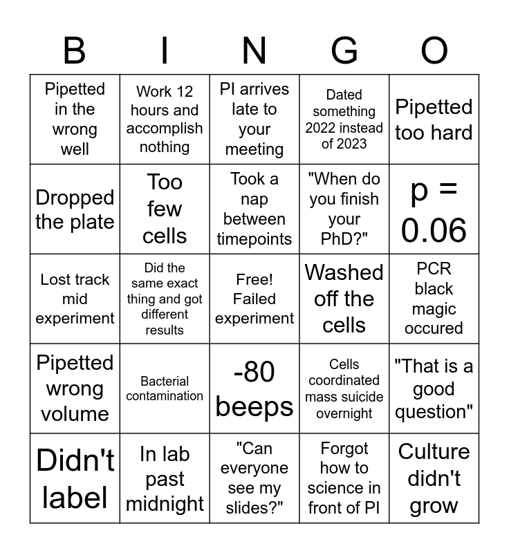 This bingo card has a free space and 24 words: Bacterial contamination, In lab past midnight, Took a nap between timepoints, Didn't label, Pipetted too hard, Pipetted in the wrong well, Dropped the plate, Work 12 hours and accomplish nothing, Washed off the cells, -80 beeps, "When do you finish your PhD?", Lost track mid experiment, Cells coordinated mass suicide overnight, "That is a good question", Too few cells, Forgot how to science in front of PI, PCR black magic occured, PI arrives late to your meeting, p = 0.06, Did the same exact thing and got different results, Culture didn't grow, Pipetted wrong volume, Dated something 2022 instead of 2023 and "Can everyone see my slides?".
