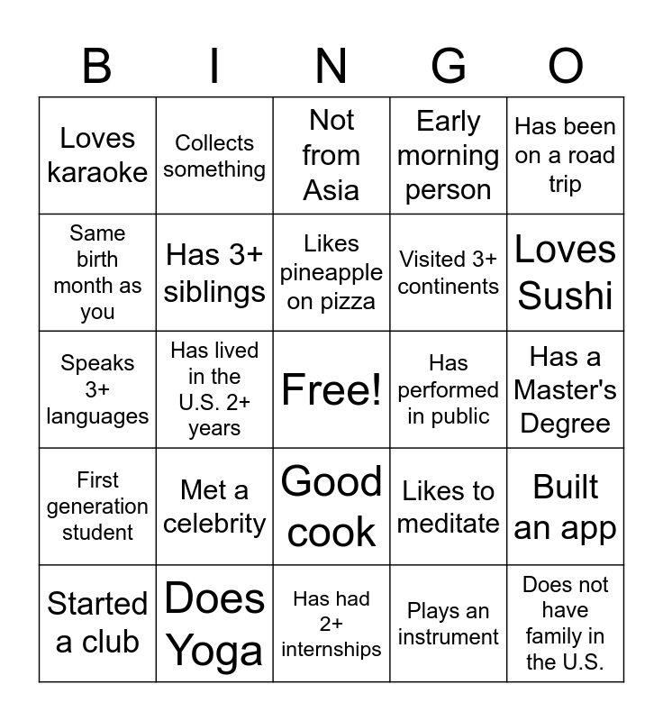 This bingo card has a free space and 24 words: Met a celebrity, Does Yoga, Likes pineapple on pizza, Started a club, Has been on a road trip, Loves karaoke, Same birth month as you, Collects something, Has performed in public, Good cook, Visited 3+ continents, Speaks 3+ languages, Likes to meditate, Built an app, Has 3+ siblings, Plays an instrument, Has a Master's Degree, Not from Asia, Loves Sushi, Has lived in the U.S. 2+ years, Does not have family in the U.S., First generation student, Early morning person and Has had 2+ internships.