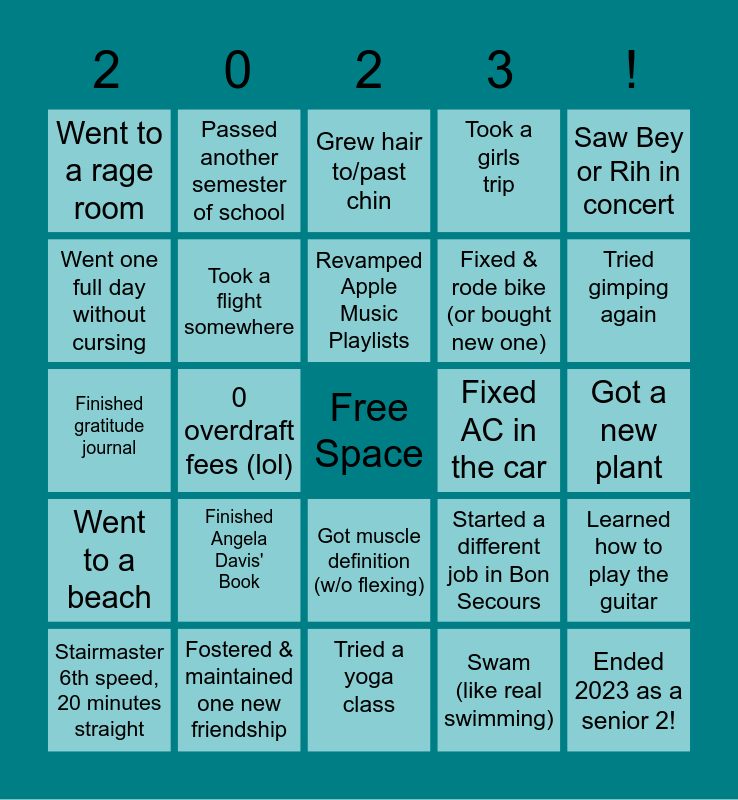 This bingo card has a free space and 24 words: Finished Angela Davis' Book, Fostered & maintained one new friendship, Revamped Apple Music Playlists, Stairmaster 6th speed, 20 minutes straight, Saw Bey or Rih in concert, Went to a rage room, Went one full day without cursing, Passed another semester of school, Fixed AC in the car, Got muscle definition (w/o flexing), Fixed & rode bike (or bought new one), Finished gratitude journal, Started a different job in Bon Secours, Learned how to play the guitar, Took a flight somewhere, Swam (like real swimming), Got a new plant, Grew hair to/past chin, Tried gimping again, 0 overdraft fees (lol), Ended 2023 as a senior 2!, Went to a beach, Took a girls trip and Tried a yoga class.