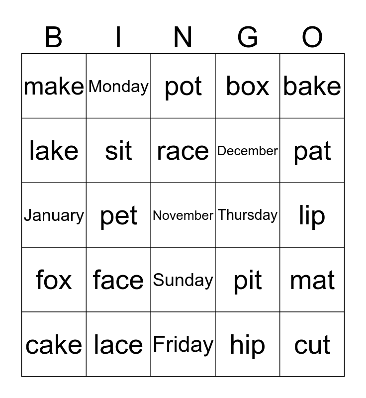 This bingo card has a free space and 24 words: face, lace, race, cake, bake, make, lake, Monday, Thursday, Sunday, December, January, pit, mat, sit, hip, lip, pot, pat, pet, cut, fox, box and Friday.