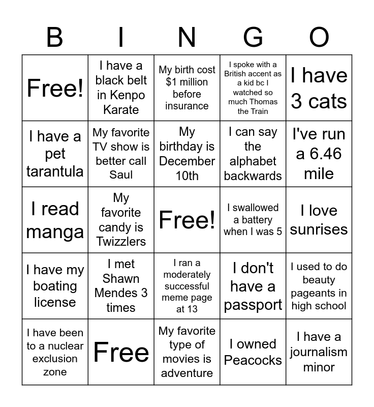 This bingo card has a free space and 24 words: I met Shawn Mendes 3 times, Free, My birthday is December 10th, I have been to a nuclear exclusion zone, I have 3 cats, Free!, I have a pet tarantula, I have a black belt in Kenpo Karate, I swallowed a battery when I was 5, I ran a moderately successful meme page at 13, I can say the alphabet backwards, I read manga, I don't have a passport, I used to do beauty pageants in high school, My favorite TV show is better call Saul, I owned Peacocks, I love sunrises, My birth cost $1 million before insurance, I've run a 6.46 mile, My favorite candy is Twizzlers, I have a journalism minor, I have my boating license, I spoke with a British accent as a kid bc I watched so much Thomas the Train and My favorite type of movies is adventure.