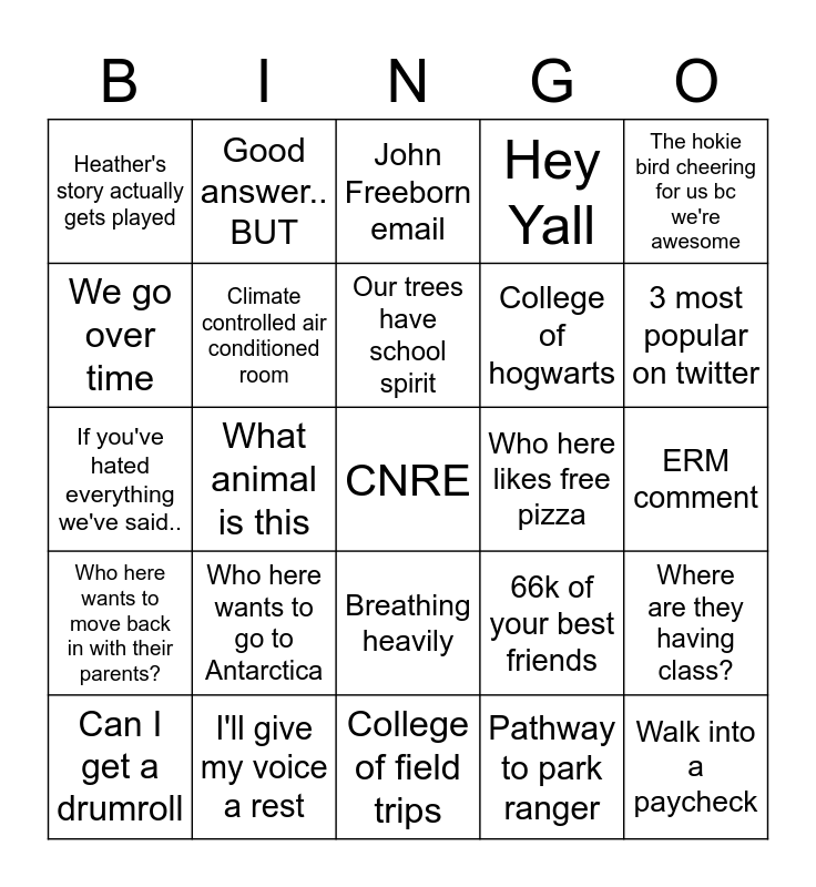 This bingo card has a free space and 24 words: Who here wants to go to Antarctica, I'll give my voice a rest, Our trees have school spirit, Can I get a drumroll, The hokie bird cheering for us bc we're awesome, Heather's story actually gets played, We go over time, Good answer.. BUT, Who here likes free pizza, Breathing heavily, College of hogwarts, If you've hated everything we've said.., 66k of your best friends, Where are they having class?, Climate controlled air conditioned room, Pathway to park ranger, ERM comment, John Freeborn email, 3 most popular on twitter, What animal is this, Walk into a paycheck, Who here wants to move back in with their parents?, Hey Yall and College of field trips.