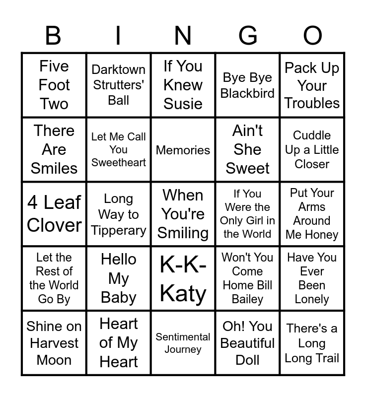 This bingo card has 30 words: Heart of My Heart, Side by Side, Long Way to Tipperary, Little Brown Jug, Five Foot Two, If You Knew Susie, Let Me Call You Sweetheart, K-K-Katy, If You Were the Only Girl in the World, Sentimental Journey, Put Your Arms Around Me Honey, When You're Smiling, Oh! You Beautiful Doll, There's a Long Long Trail, Cuddle Up a Little Closer, For Me &My Gal, Won't You Come Home Bill Bailey, Let the Rest of the World Go By, Hello My Baby, Pack Up Your Troubles, 4 Leaf Clover, When you Wore a Tulip, Darktown Strutters' Ball, Ain't She Sweet, There Are Smiles, Bye Bye Blackbird, Have You Ever Been Lonely, Shine on Harvest Moon, Memories and In the Good Old Summertime.