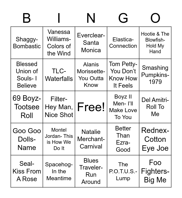 This bingo card has a free space and 25 words: Montel Jordan- This is How We Do It, Blues Traveler- Run Around, Alanis Morissette- You Outta Know, Seal- Kiss From A Rose, Hootie & The Blowfish- Hold My Hand, Shaggy-Bombastic, Blessed Union of Souls- I Believe, Vanessa Williams- Colors of the Wind, Boyz II Men- I’ll Make Love To You, Natalie Merchant- Carnival, Tom Petty- You Don’t Know How It Feels, 69 Boyz- Tootsee Roll, Better Than Ezra- Good, Rednex- Cotton Eye Joe, TLC-Waterfalls, Coolio- Gangsta’s Paradise, Del Amitri- Roll To Me, Everclear- Santa Monica, Smashing Pumpkins- 1979, Filter- Hey Man, Nice Shot, Foo Fighters- Big Me, Spacehog- In the Meantime, Goo Goo Dolls- Name, Elastica- Connection and The P.O.T.U.S.- Lump.