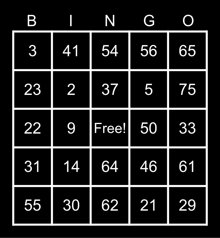 This bingo card has a free space and 24 words: 14, 30, 37, 55, 65, 3, 23, 41, 50, 64, 5, 22, 46, 61, 2, 21, 33, 54, 75, 9, 29, 31, 56 and 62.