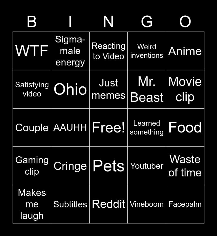 This bingo card has a free space and 24 words: Cringe, Subtitles, Just memes, Makes me laugh, Anime, WTF, Satisfying video, Sigma-male energy, Learned something, Pets, Mr. Beast, Couple, Youtuber, Waste of time, Ohio, Vineboom, Food, Reacting to Video, Movie clip, AAUHH, Facepalm, Gaming clip, Weird inventions and Reddit.