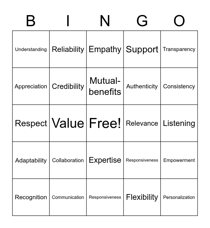 This bingo card has a free space and 30 words: Communication, Trust, Value, Partnership, Understanding, Empathy, Credibility, Expertise, Relevance, Responsiveness, Listening, Personalization, Flexibility, Solution-oriented, Consistency, Proactivity, Responsiveness, Adaptability, Collaboration, Transparency, Respect, Customer-centric, Reliability, Authenticity, Appreciation, Support, Empowerment, Recognition, Mutual-benefits and Long-term focus.
