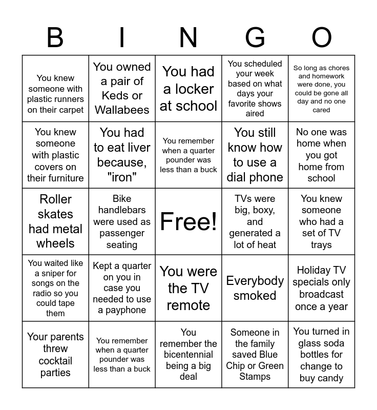 This bingo card has a free space and 24 words: Kept a quarter on you in case you needed to use a payphone, You remember when a quarter pounder was less than a buck, You remember when a quarter pounder was less than a buck, Your parents threw cocktail parties, So long as chores and homework were done, you could be gone all day and no one cared, You knew someone with plastic runners on their carpet, You knew someone with plastic covers on their furniture, You owned a pair of Keds or Wallabees, TVs were big, boxy, and generated a lot of heat, You were the TV remote, You still know how to use a dial phone, Roller skates had metal wheels, Everybody smoked, Holiday TV specials only broadcast once a year, You had to eat liver because, "iron", Someone in the family saved Blue Chip or Green Stamps, You knew someone who had a set of TV trays, You had a locker at school, No one was home when you got home from school, Bike handlebars were used as passenger seating, You turned in glass soda bottles for change to buy candy, You waited like a sniper for songs on the radio so you could tape them, You scheduled your week based on what days your favorite shows aired and You remember the bicentennial being a big deal.