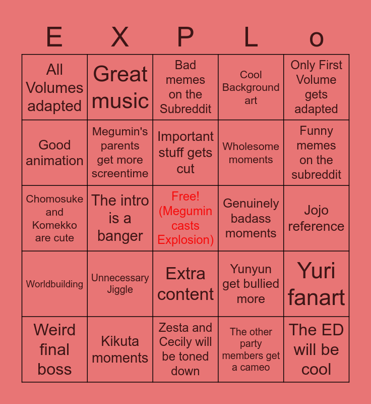 This bingo card has a free space and 24 words: Unnecessary Jiggle, Kikuta moments, Important stuff gets cut, Weird final boss, Only First Volume gets adapted, All Volumes adapted, Good animation, Great music, Genuinely badass moments, Extra content, Wholesome moments, Chomosuke and Komekko are cute, Yunyun get bullied more, Yuri fanart, Megumin's parents get more screentime, The other party members get a cameo, Jojo reference, Bad memes on the Subreddit, Funny memes on the subreddit, The intro is a banger, The ED will be cool, Worldbuilding, Cool Background art and Zesta and Cecily will be toned down.
