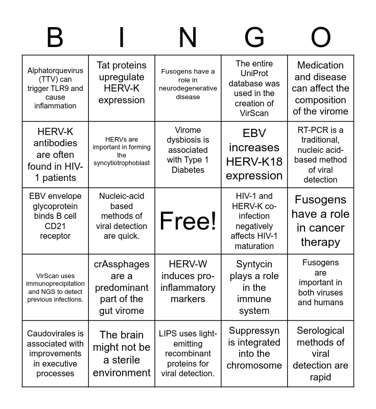 This bingo card has a free space and 24 words: crAssphages are a predominant part of the gut virome, The brain might not be a sterile environment, Virome dysbiosis is associated with Type 1 Diabetes, Caudovirales is associated with improvements in executive processes, Medication and disease can affect the composition of the virome, Alphatorquevirus (TTV) can trigger TLR9 and cause inflammation, HERV-K antibodies are often found in HIV-1 patients, Tat proteins upregulate HERV-K expression, HIV-1 and HERV-K co-infection negatively affects HIV-1 maturation, HERV-W induces pro-inflammatory markers, EBV increases HERV-K18 expression, EBV envelope glycoprotein binds B cell CD21 receptor, Syntycin plays a role in the immune system, Fusogens are important in both viruses and humans, HERVs are important in forming the syncytiotrophoblast, Suppressyn is integrated into the chromosome, Fusogens have a role in cancer therapy, Fusogens have a role in neurodegenerative disease, RT-PCR is a traditional, nucleic acid-based method of viral detection, Nucleic-acid based methods of viral detection are quick., Serological methods of viral detection are rapid, VirScan uses immunoprecipitation and NGS to detect previous infections., The entire UniProt database was used in the creation of VirScan and LIPS uses light-emitting recombinant proteins for viral detection..