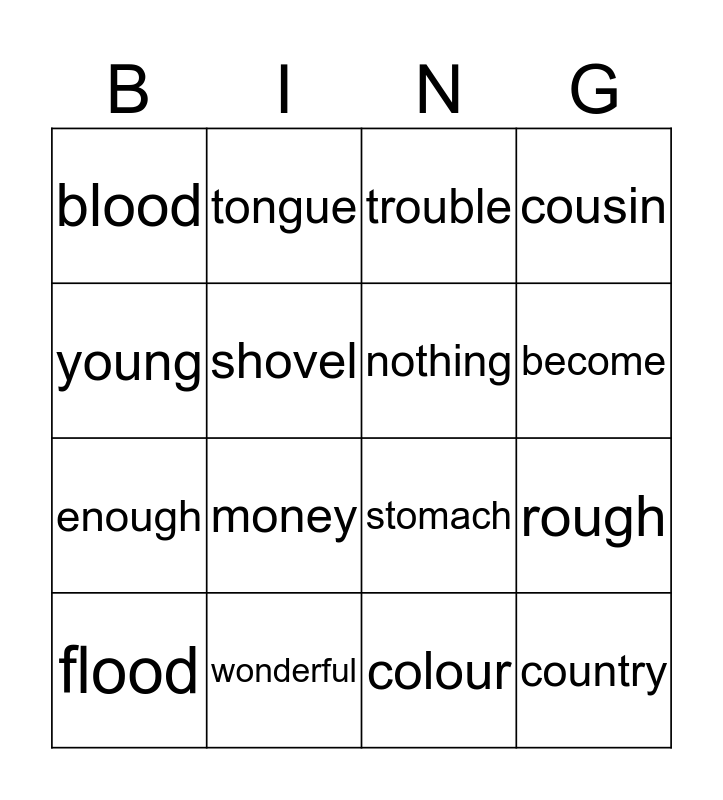 This bingo card has a free space and 15 words: flood, country, trouble, blood, become, young, money, colour, shovel, enough, rough, cousin, nothing, tongue and wonderful.