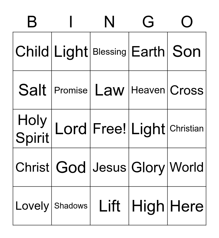 This bingo card has a free space and 29 words: Lovely, Praise, Lord, Almighty, Child, Blessing, Promise, God, Light, Shadows, Christian, Here, Lift, High, Cross, Father, Jesus, Christ, Son, Holy Spirit, Glory, Amen, Heaven, Salt, Earth, Light, World, Law and Prophets.