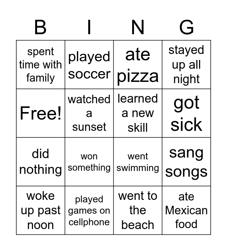 This bingo card has 16 words: played games on cellphone, sang songs, ate pizza, spent time with family, did nothing, played soccer, went swimming, went to the beach, Free!, watched a sunset, woke up past noon, stayed up all night, won something, got sick, learned a new skill and ate Mexican food.