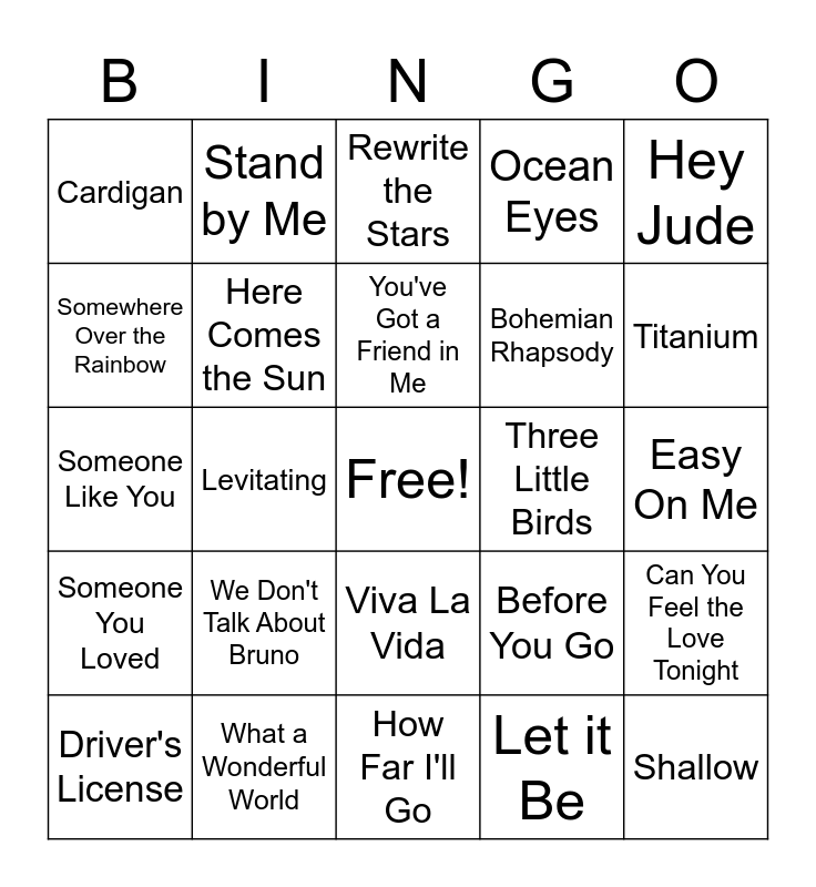 This bingo card has a free space and 29 words: Driver's License, Watermelon Sugar, Levitating, Halo, Cardigan, Rewrite the Stars, Here Comes the Sun, We Don't Talk About Bruno, Three Little Birds, What a Wonderful World, Easy On Me, Shallow, How Far I'll Go, Let it Be, Titanium, True Colors, Viva La Vida, Someone You Loved, Hey Jude, Someone Like You, Before You Go, Firework, Bohemian Rhapsody, Somewhere Over the Rainbow, Ocean Eyes, Stand by Me, Can You Feel the Love Tonight, You've Got a Friend in Me and Can't Help Falling in Love.