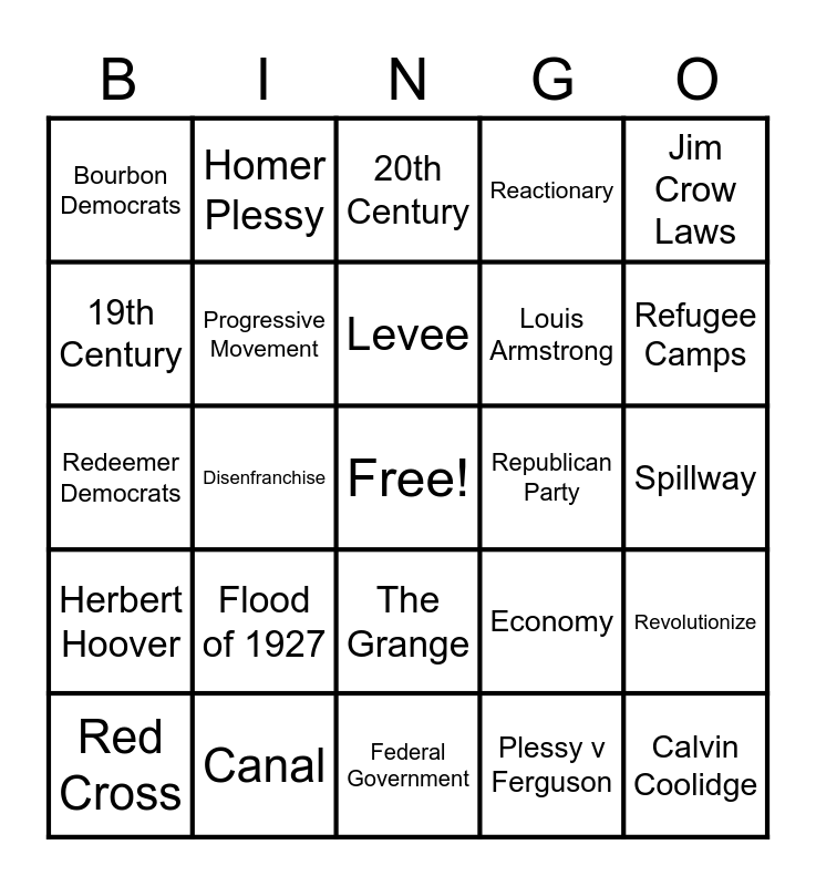 This bingo card has a free space and 24 words: Flood of 1927, Canal, Levee, Red Cross, Jim Crow Laws, Bourbon Democrats, 19th Century, Homer Plessy, Republican Party, The Grange, Louis Armstrong, Redeemer Democrats, Economy, Revolutionize, Progressive Movement, Plessy v Ferguson, Spillway, 20th Century, Refugee Camps, Disenfranchise, Calvin Coolidge, Herbert Hoover, Reactionary and Federal Government.