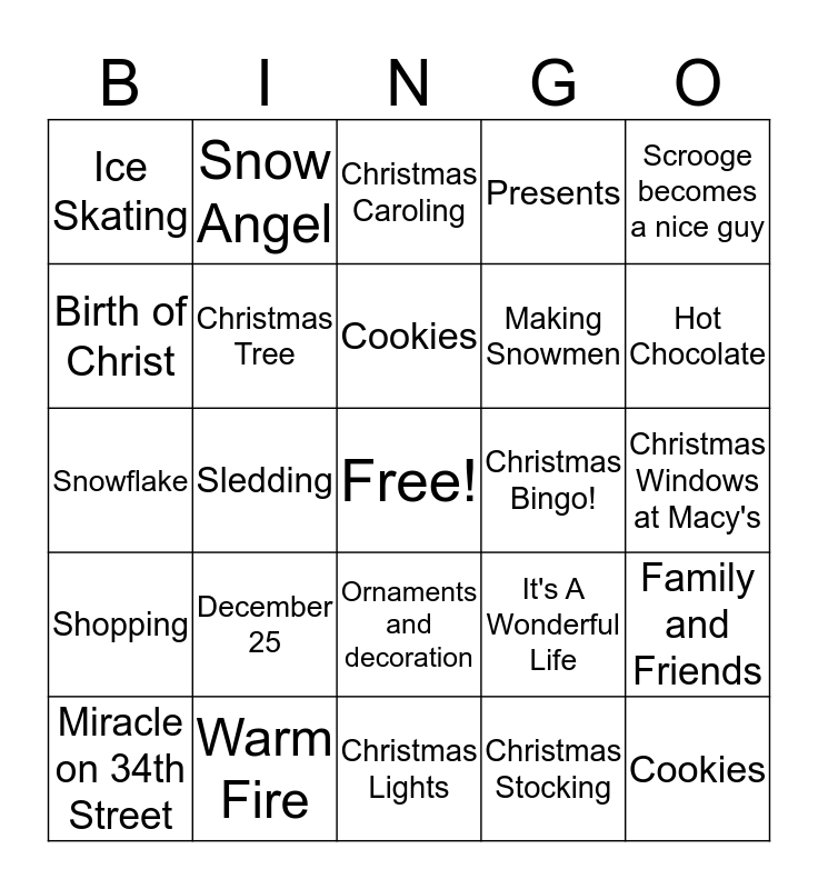 This bingo card has a free space and 24 words: December 25, Warm Fire, Cookies, Miracle on 34th Street, Scrooge becomes a nice guy, Ice Skating, Birth of Christ, Snow Angel, Christmas Bingo!, Ornaments and decoration, Making Snowmen, Snowflake, It's A Wonderful Life, Family and Friends, Christmas Tree, Christmas Stocking, Christmas Windows at Macy's, Christmas Caroling, Hot Chocolate, Sledding, Cookies, Shopping, Presents and Christmas Lights.