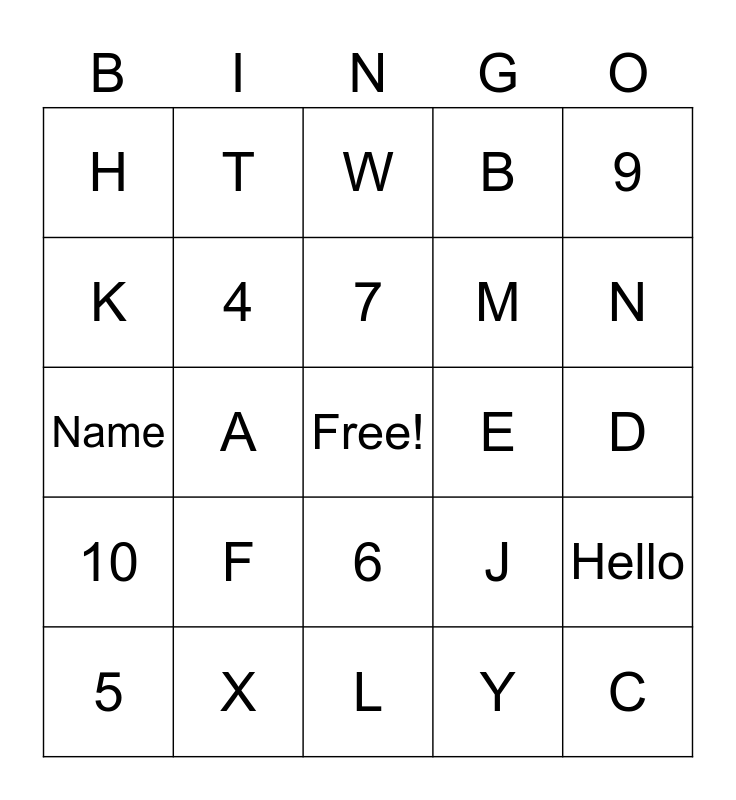 This bingo card has a free space and 39 words: 1, 2, 3, 4, 5, 6, 7, 8, 9, 10, A, B, C, D, E, F, G, H, I, J, K, L, M, N, O, P, Q, R, S, T, U, V, W, X, Y, Z, Hello, Name and Deaf.