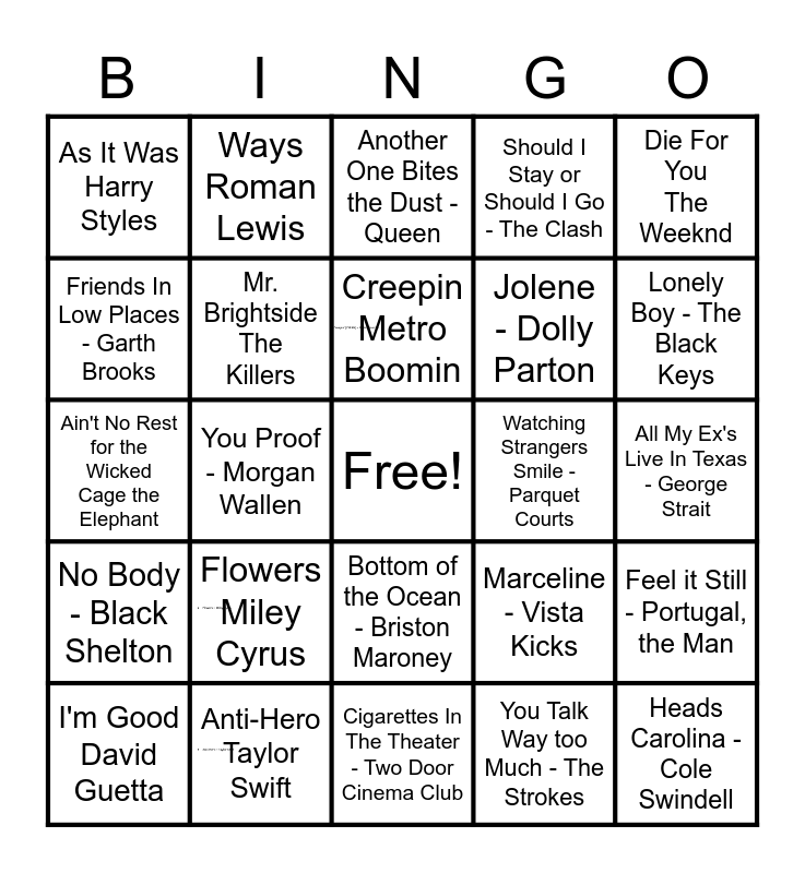 This bingo card has 3 images, a free space and 24 words: Flowers Miley Cyrus, Anti-Hero Taylor Swift, Creepin Metro Boomin, I'm Good David Guetta, Die For You The Weeknd, As It Was Harry Styles, Friends In Low Places - Garth Brooks, Ways Roman Lewis, Watching Strangers Smile - Parquet Courts, Bottom of the Ocean - Briston Maroney, Jolene - Dolly Parton, Ain't No Rest for the Wicked Cage the Elephant, Marceline - Vista Kicks, Feel it Still - Portugal, the Man, Mr. Brightside The Killers, You Talk Way too Much - The Strokes, All My Ex's Live In Texas - George Strait, Another One Bites the Dust - Queen, Lonely Boy - The Black Keys, You Proof - Morgan Wallen, Heads Carolina - Cole Swindell, No Body - Black Shelton, Should I Stay or Should I Go - The Clash and Cigarettes In The Theater - Two Door Cinema Club.