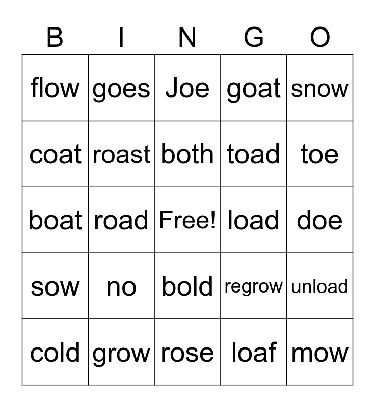 This bingo card has a free space and 24 words: no, grow, both, cold, snow, flow, coat, goes, load, bold, toad, boat, regrow, unload, roast, loaf, doe, Joe, toe, road, mow, sow, goat and rose.