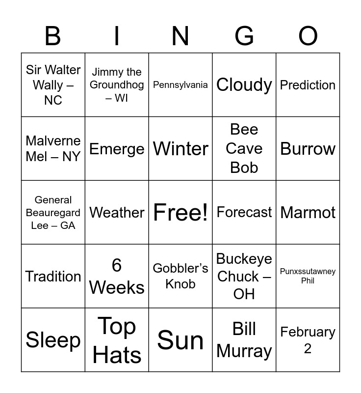 This bingo card has a free space and 42 words: Groundhog, Winter, Early Spring, 6 Weeks, Bill Murray, Punxssutawney Phil, February 2, Shadow, Pennsylvania, Gobbler’s Knob, Marmot, Burrow, Weather, Prediction, 1886, Buckeye Chuck – OH, Dunkirk Dave – NY, General Beauregard Lee – GA, Holtsville Hall – NY, Jimmy the Groundhog – WI, Malverne Mel – NY, Octoraro Orphie – PA, Shubenacadie Sam – Canada, Sir Walter Wally – NC, Staten Island Chuck, Woodchuck, Bee Cave Bob, Legend, Prediction, Prognosticator, Den, Tradition, Emerge, Sun, No Shadow, Sleep, Top Hats, Forecast, Festival, Sunshine, Cloudy and Hibernate.