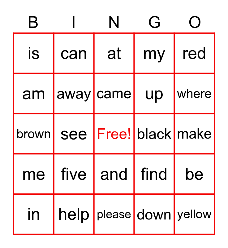 This bingo card has a free space and 49 words: we, yellow, jump, please, five, new, can, now, am, blue, away, my, be, find, look, big, came, black, run, red, see, down, is, up, come, where, in, it, and, me, go, for, funny, the, help, here, little, look, make, not, play, said, three, you, brown, at, are, get and new.