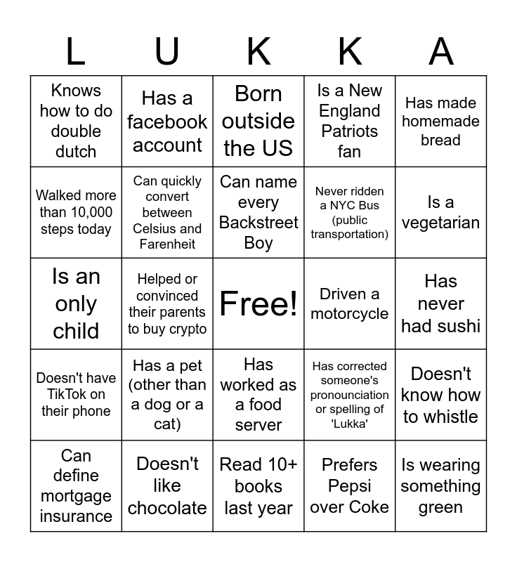This bingo card has a free space and 24 words: Has a pet (other than a dog or a cat), Doesn't like chocolate, Can name every Backstreet Boy, Can define mortgage insurance, Has made homemade bread, Knows how to do double dutch, Walked more than 10,000 steps today, Has a facebook account, Driven a motorcycle, Has worked as a food server, Never ridden a NYC Bus (public transportation), Is an only child, Has corrected someone's pronounciation or spelling of 'Lukka', Doesn't know how to whistle, Can quickly convert between Celsius and Farenheit, Prefers Pepsi over Coke, Has never had sushi, Born outside the US, Is a vegetarian, Helped or convinced their parents to buy crypto, Is wearing something green, Doesn't have TikTok on their phone, Is a New England Patriots fan and Read 10+ books last year.