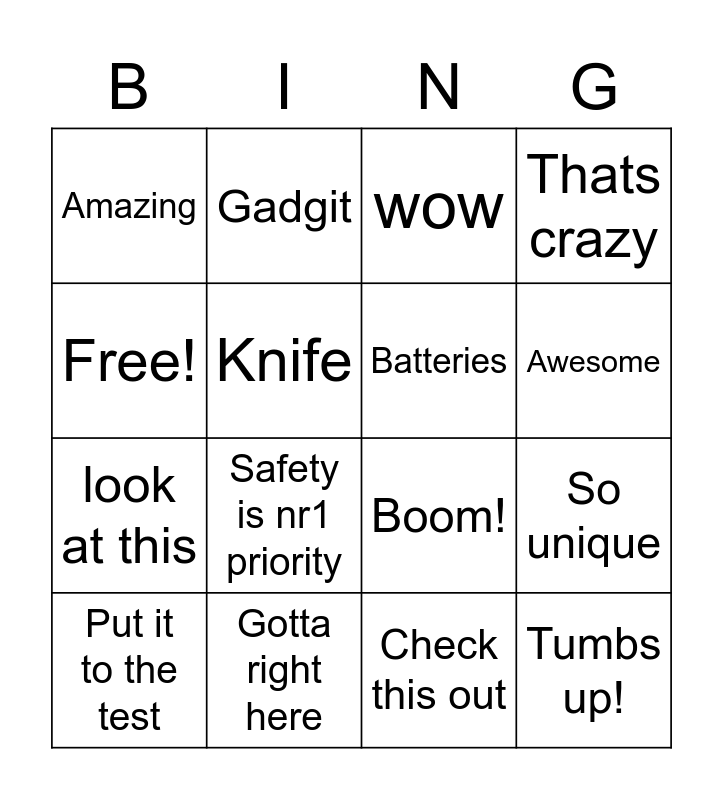 This bingo card has 16 words: Gotta right here, So unique, wow, Amazing, look at this, Gadgit, Boom!, Check this out, Free!, Knife, Put it to the test, Thats crazy, Safety is nr1 priority, Awesome, Batteries and Tumbs up!.