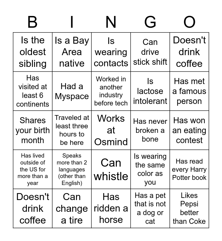 This bingo card has a free space and 24 words: Speaks more than 2 languages (other than English), Can change a tire, Worked in another industry before tech, Doesn't drink coffee, Doesn't drink coffee, Is the oldest sibling, Has visited at least 6 continents, Is a Bay Area native, Has never broken a bone, Can whistle, Is lactose intolerant, Shares your birth month, Is wearing the same color as you, Has read every Harry Potter book, Had a Myspace, Has a pet that is not a dog or cat, Has won an eating contest, Is wearing contacts, Has met a famous person, Traveled at least three hours to be here, Likes Pepsi better than Coke, Has lived outside of the US for more than a year, Can drive stick shift and Has ridden a horse.