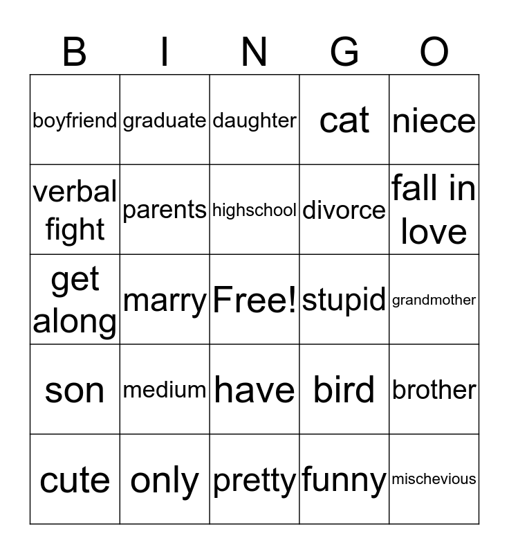 This bingo card has a free space and 24 words: medium, only, highschool, cute, niece, boyfriend, verbal fight, graduate, stupid, have, divorce, get along, bird, brother, parents, funny, grandmother, daughter, fall in love, marry, mischevious, son, cat and pretty.