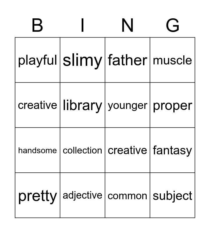 This bingo card has 16 words: adjective, fantasy, father, playful, handsome, slimy, creative, common, creative, library, pretty, muscle, collection, proper, younger and subject.