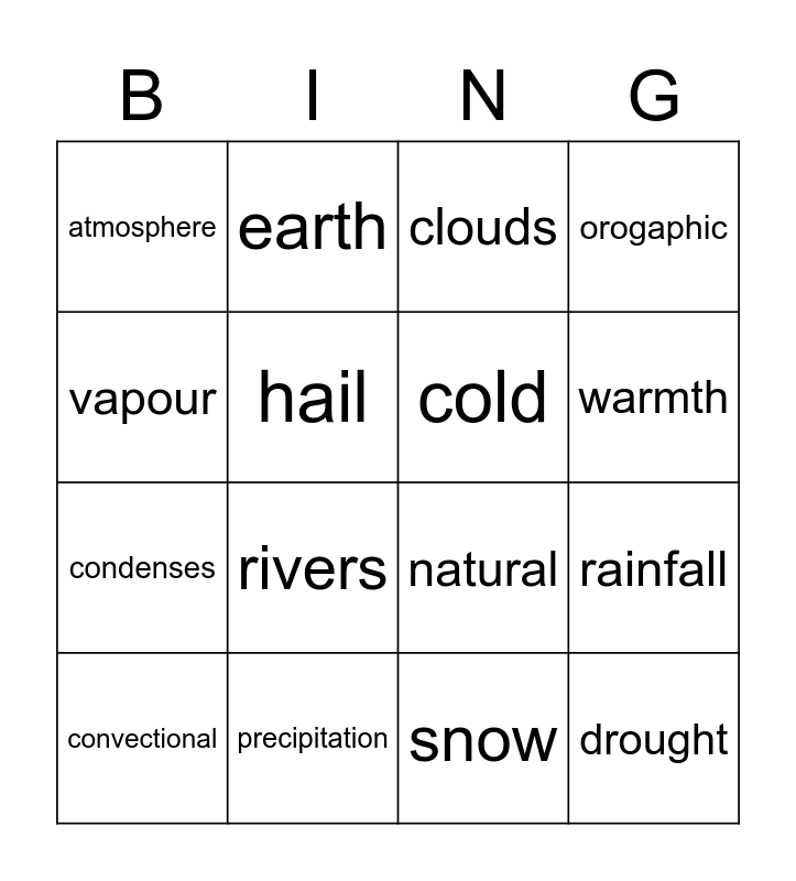 This bingo card has 16 words: precipitation, rainfall, clouds, atmosphere, condenses, earth, natural, snow, vapour, hail, convectional, orogaphic, rivers, warmth, cold and drought.