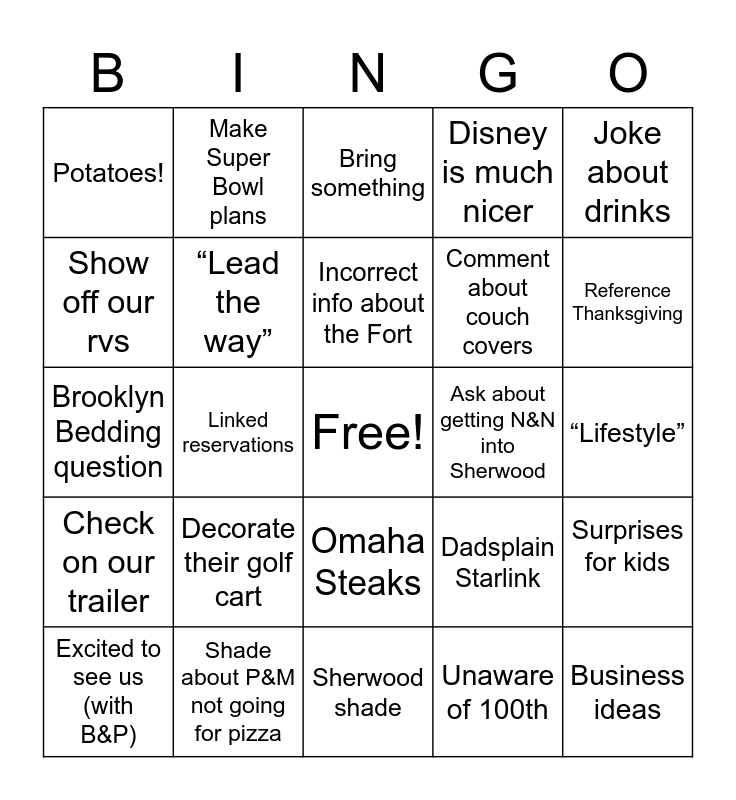 This bingo card has a free space and 24 words: Decorate their golf cart, Shade about P&M not going for pizza, Incorrect info about the Fort, Excited to see us (with B&P), Joke about drinks, Potatoes!, Show off our rvs, Make Super Bowl plans, Ask about getting N&N into Sherwood, Omaha Steaks, Comment about couch covers, Brooklyn Bedding question, Dadsplain Starlink, Surprises for kids, “Lead the way”, Unaware of 100th, “Lifestyle”, Bring something, Reference Thanksgiving, Linked reservations, Business ideas, Check on our trailer, Disney is much nicer and Sherwood shade.