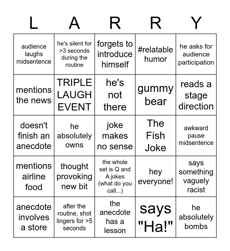 This bingo card has 25 words: thought provoking new bit, the anecdote has a lesson, he's not there, anecdote involves a store, he asks for audience participation, audience laughs midsentence, mentions the news, he's silent for >3 seconds during the routine, The Fish Joke, the whole set is Q and A jokes (what do you call...), gummy bear, doesn't finish an anecdote, hey everyone!, says something vaguely racist, TRIPLE LAUGH EVENT, he absolutely bombs, awkward pause midsentence, forgets to introduce himself, reads a stage direction, he absolutely owns, joke makes no sense, after the routine, shot lingers for >5 seconds, mentions airline food, #relatable humor and says "Ha!".
