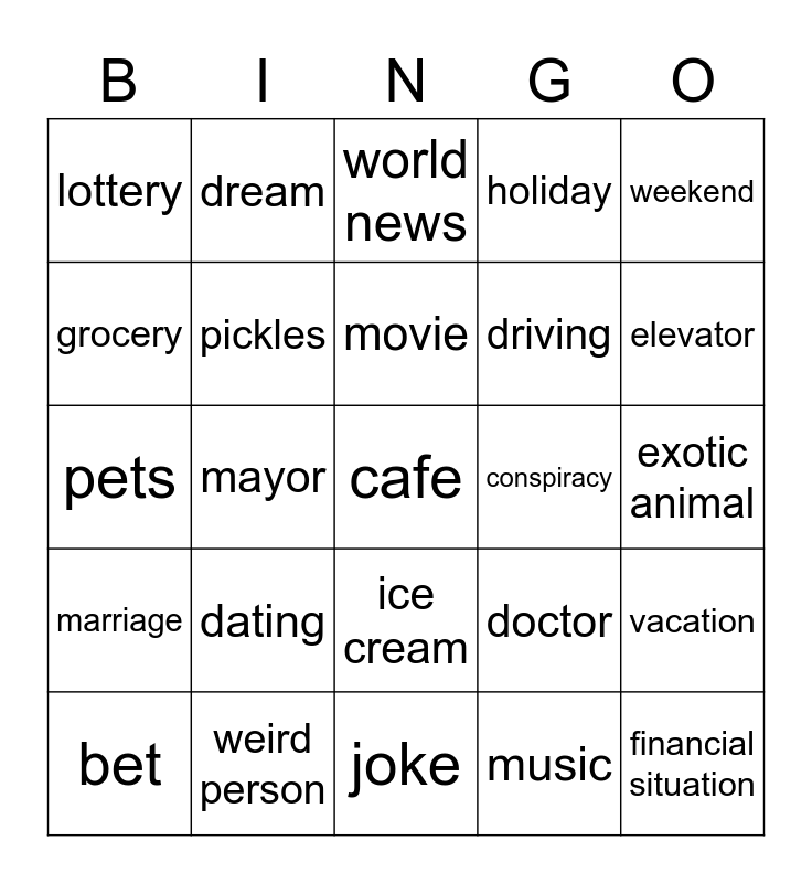 This bingo card has a free space and 24 words: dating, weird person, movie, bet, weekend, lottery, grocery, dream, conspiracy, ice cream, driving, pets, doctor, vacation, pickles, music, exotic animal, world news, elevator, mayor, financial situation, marriage, holiday and joke.