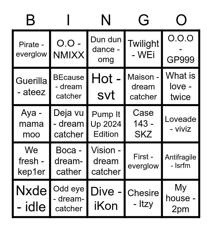 This bingo card has a free space and 24 words: Boca - dream- cather, Odd eye - dream-catcher, Hot - svt, Nxde - idle, O.O.O - GP999, Pirate - everglow, Guerilla - ateez, O.O - NMIXX, Case 143 - SKZ, Vision - dream catcher, Maison - dream catcher, Aya - mama moo, First - everglow, Antifragile - lsrfm, BEcause - dream catcher, Chesire - Itzy, Loveade - viviz, Dun dun dance - omg, What is love - twice, Deja vu - dream catcher, My house - 2pm, We fresh - kep1er, Twilight - WEi and Dive - iKon.