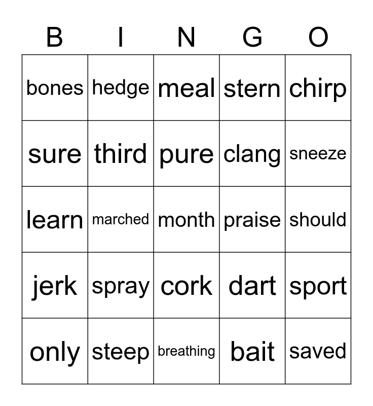 This bingo card has 40 words: since, learn, toward, third, steep, cork, pure, hurt, chirp, jerk, marched, stern, month, should, praise, spray, claimed, bones, grain, meal, sport, bait, clang, sure, watching, clear, born, gray, saved, heard, early, only, turns, dart, sneeze, breathing, creeping, spark, hedge and farm.